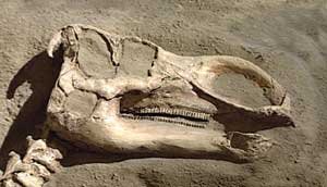 | An Edmontonian Then & Now: Edmontosaurus, a herbivorous dinosaur, as it once looked, and as found in the Badlands of Alberta, and now on show at the Royal Tyrrell Museum in Drumheller, AB. (As featured in our international Gold Medal winning program, "In Search of the Colossal Fossil." |