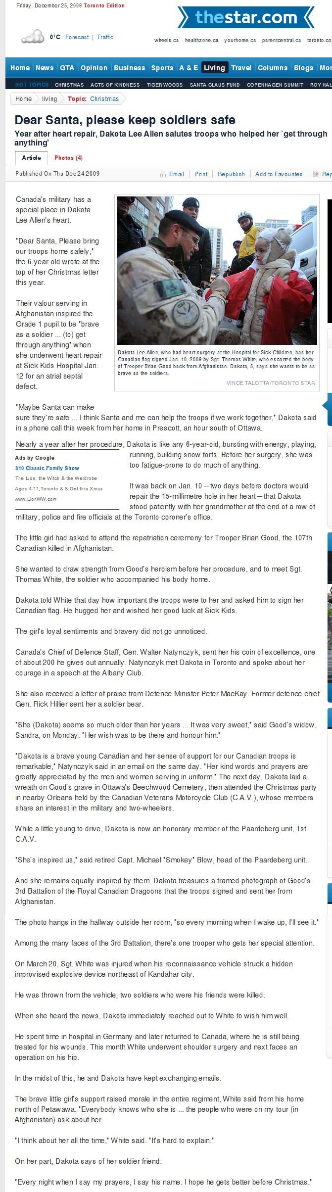 Mercifully, the impressionable six year old Dakota Lee Allen is not exposed to images of all the blown apart women and children in Afghanistan. The patriotic Canadian media bosses censor from the papers the many pictures of mangled women and children killed by the carnage unleashed by the NATO forces in Afghanistan.