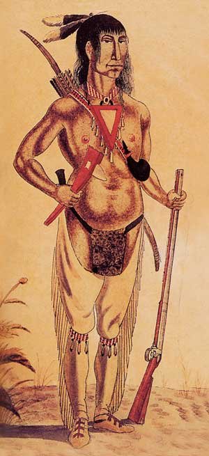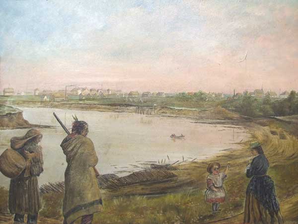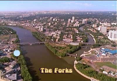 Fork U at the Forks: Just like its Métis people, Canada has treated its poverty-bedeviled Indian people badly - even the UN says so - being most generous with naming places after them, like the Assiniboine River below right, but spending its big bucks elsewhere to promote more important and more politically powerful groups. In Canada, poor Aboriginal people, just are not kosher... "Where is my museum?" asks Salteaux Chief Peguis, left and below, who for the first half of the nineteenth century promoted peaceful existence with the Hudson's Bay Company and the many white peoples who followed it into his tribe's territories. The answer - "Fork U, Chief!" Below, the blue dot is the vantage point for all the scenes painted above.