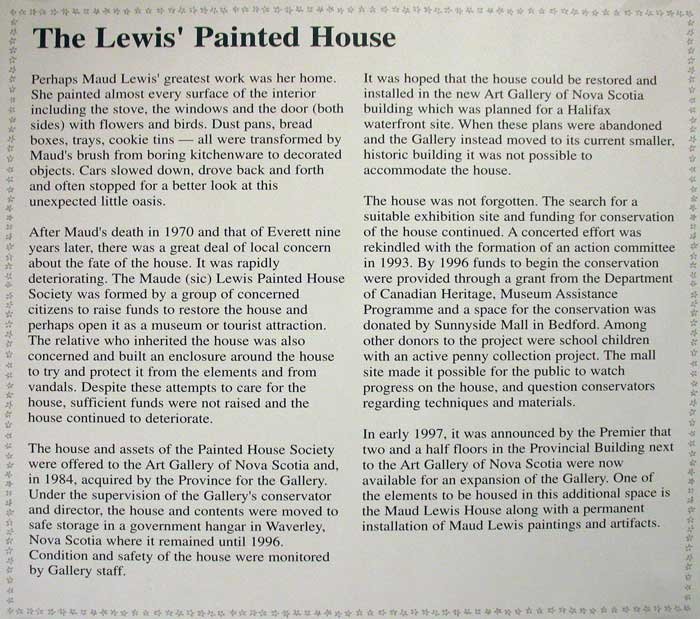 A Canadian Tragedy - In homage to Maud Lewis, in 1996 a group of private citizens from Digby, Nova Scotia, near Marshalltown, using their own money, launched the initiative and effort to save and preserve the house for posterity, getting some contributory funding from government.
